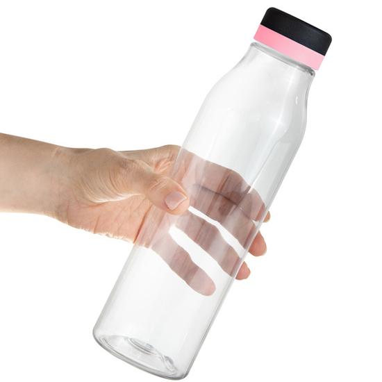 Botella de plástico transparente con tapa a rosca color negro mate con anillo de silicona de diferentes colores. Medidas: Ø 7 x 24,5 cm. Capacidad: 750 ml. Materiales: PET Cristalino.