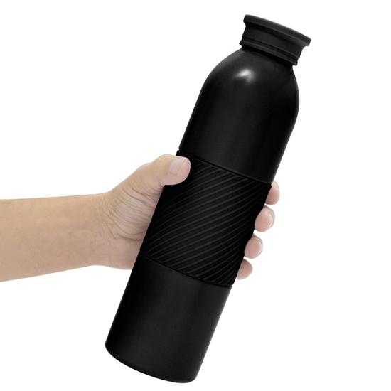 Capacidad 600 ml. Acero inoxidable. Botella doble pared, sellada al vacío. Interior en acero 304 y exterior en acero 201. Grip de silicona texturado para mejor agarre. Pintura acabado mate. Tapa de polipropileno y acero inoxidable 201. Presentación en caja de regalo kraft. Medida Ø 7 cm x 26,5 cm.