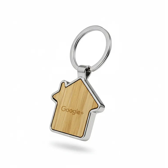 Llavero metálico con silueta de casa y bambú. Fabricado en aleación de zinc y bambú en tono natural. Cuenta con anilla resistente y diseño de casa ideal para branding. Es ideal para inmobiliarias, constructoras, promociones y obsequios corporativos.