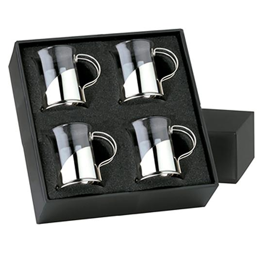 Set cuatro tazas de vidrio, de 200 ml c/u, con base plateada de acero inoxidable. Productos insertos en espuma troquelada negra dentro de caja de cartón con tapa y funda negra Medidas de caja: 28 x 26 x 9.5 cm.