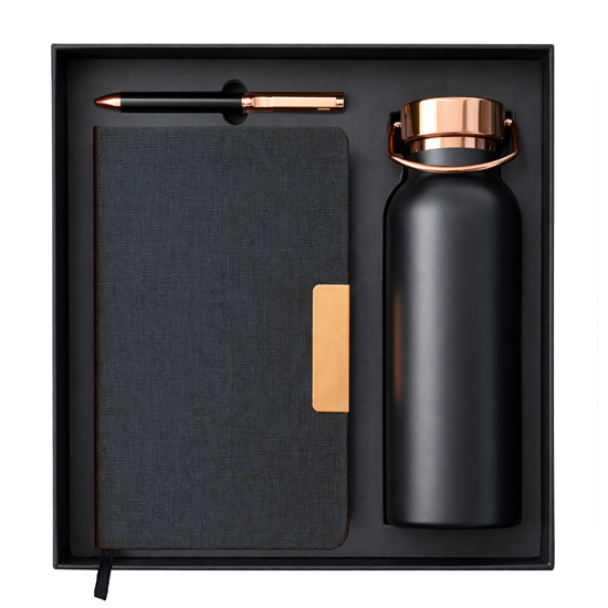 Set para regalo que incluye 1 bolígrafo, 1 libreta y 1 botella en A. Inoxidable. Presentación en caja negra de lujo con interior de cuna EVA negro. Capacidad Botella 500 ml.