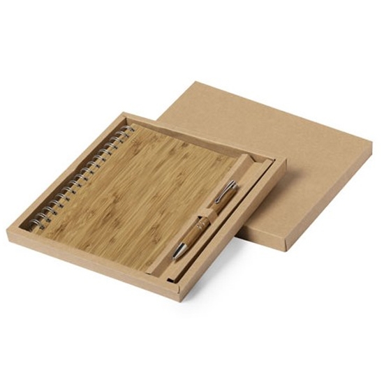 Set de la línea nature. Incluye libreta de anillas con tapas rígidas en bambú, con 80 hojas de disposición a una raya y diseño eco. Bolígrafo de mecanismo pulsador, con cuerpo en bambú y accesorios metálicos -cartucho jumbo y tinta negra.