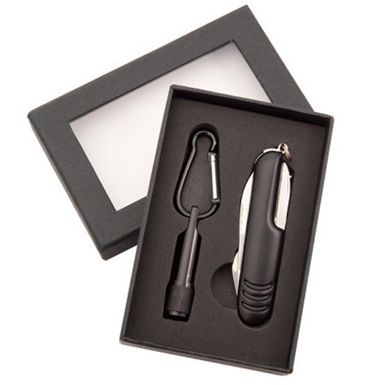 Set de aluminio de navaja multiusos con 7 funciones y linterna mosquetón. En variados colores y presentado en estuche individual con ventana y suave espuma interior troquelada. Pilas de botón incluidas. 1 Led. Navaja 7 Funciones. Pilas Botón Incluidas